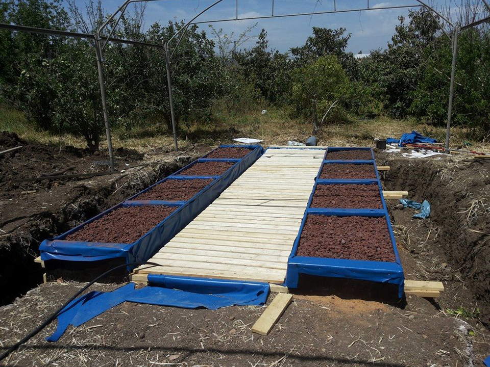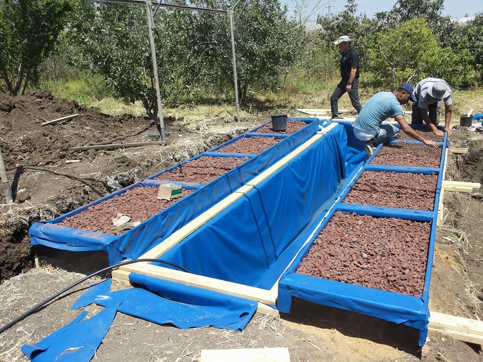 Aquaponics in greenhouse is a project that enhances the efficiency of greenhouses by integrating an earth embedded aquaponics system in an existing greenhouse. This system utilizes the paths between beds in greenhouses as spaces for producing fish and create a heat battery inside the greenhouse to reduce temperature fluctuations. In April 2014 MEEZAN built this system in a greenhouse at Hakurtna Farm, Tulkarm, Palestine.