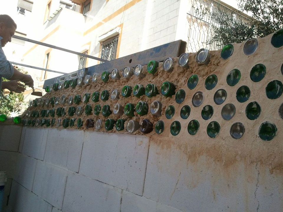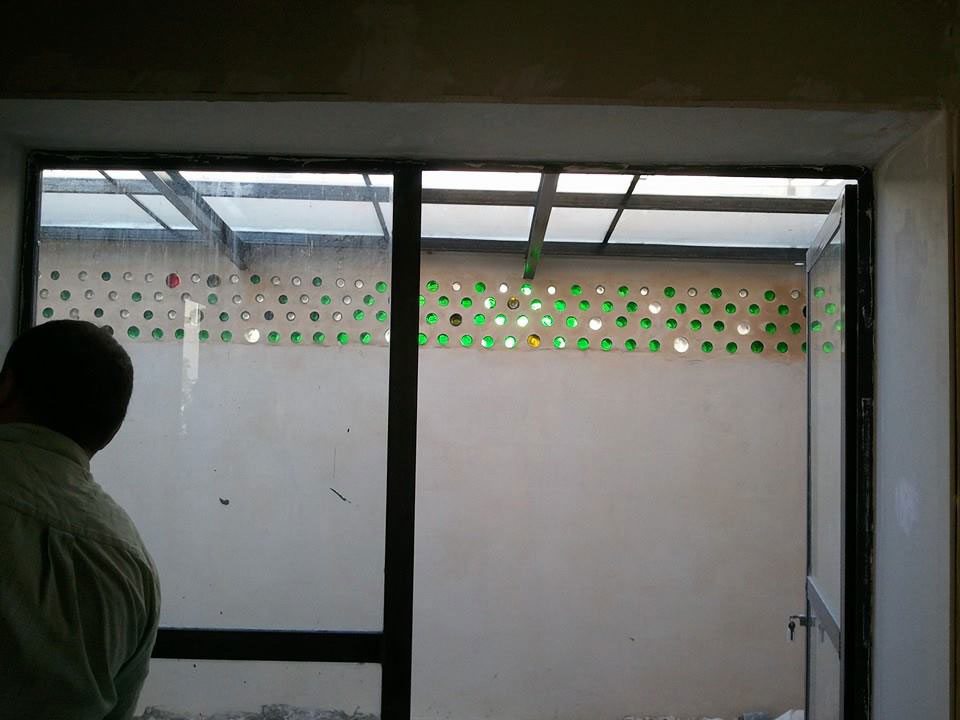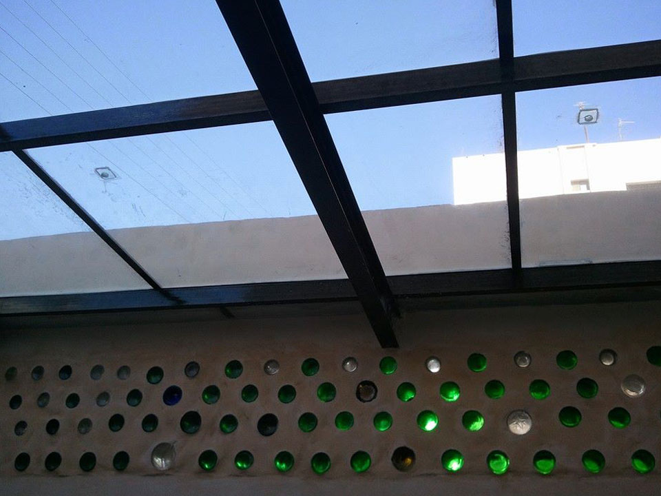 Recycled Material Recycled material is used as construction material in the Urban Ship: decorative wall was built using empty bottles as ‘bricks’ and both the ceiling and the floor were made of old securit glass doors.
